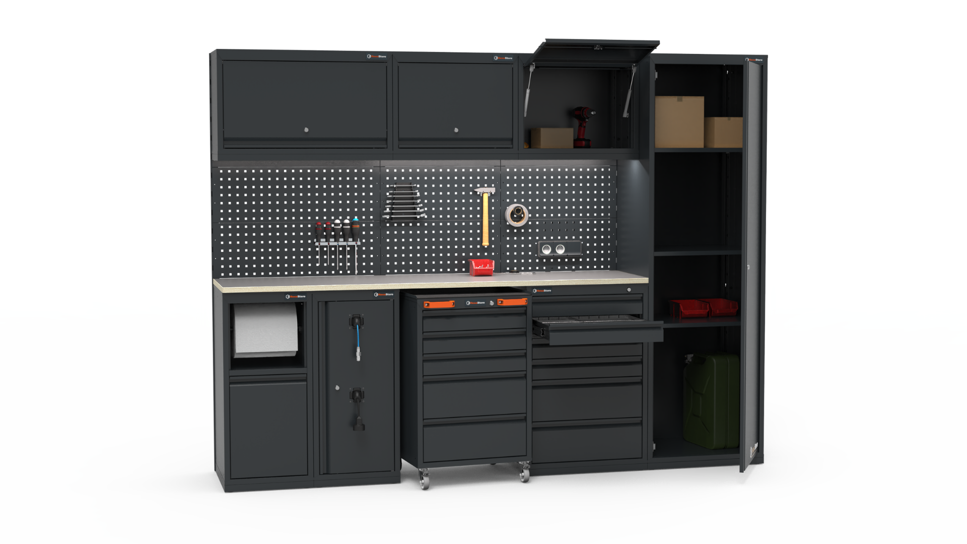 Modularna konstrukcja pozwala na dowolną konfigurację przestrzeni wewnętrznej szaf, w zależności od potrzeb pojedyncza szafa w kilka minut może zmienić się ze zwykłej przestrzeni magazynowej wyposażonej w półki na przestrzeń warsztatową z miejscem na zawieszenie narzędzi na panelach perforowanych lub ich odłożenie w szuflady.